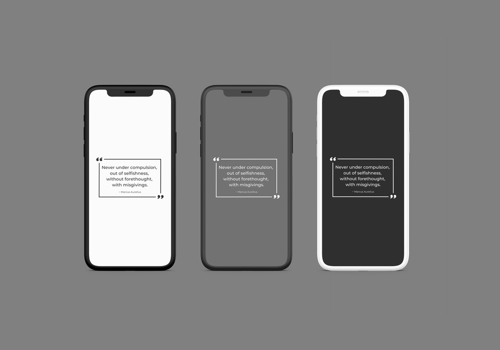 A collection of simple Stoic wallpapers for phones and computers. Wallpapers come in black, grey and white. Each wallpaper features an insightful quote from a famous Stoic. Currently there are 11 Marcus Aurelius Quotes. I will continue updating this set indefinitely. Purchase gets you access to the entire current set and anything added for life.Current quotes:“Never under compulsion, out of selfishness, without forethought, with misgivings.”“…to care for all human beings is part of being human.”“Needing no oath or witness.”“It can ruin your life only if it ruins your character. Otherwise it cannot harm you – inside or out.” “Choose not to be harmed – and you won’t feel harmed. Don’t feel harmed – and you haven’t been.”“Proper understanding; Unselfish action; Truthful speech.”“The tranquillity that comes when you stop caring what they say. Or think, or do. Only what you do.” “Disturbance comes only from within – from our own perceptions.” “Disease, death, blasphemy, conspiracy … everything that makes stupid people happy or angry.”“It was for the best. So Nature had no choice but to do it.”"Be satisfied with even the smallest progress, and treat the outcome of it all as unimportant."If you have any quotes you want added, please send me an email at hello@thestoicpath.com
